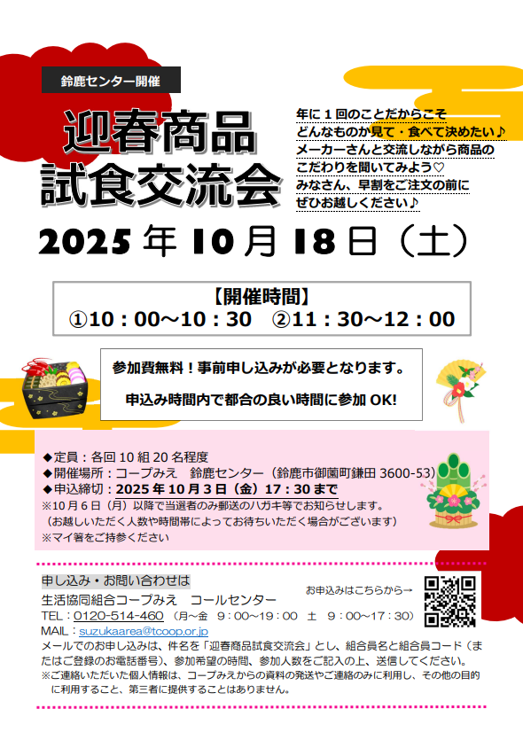 ◆メールでのお申し込みは、件名を「迎春商品試食交流会」とし、組合員名と組合員コード(またはご登録のお電話番号)、参加希望の時間、参加人数をご記入の上、送信してください。