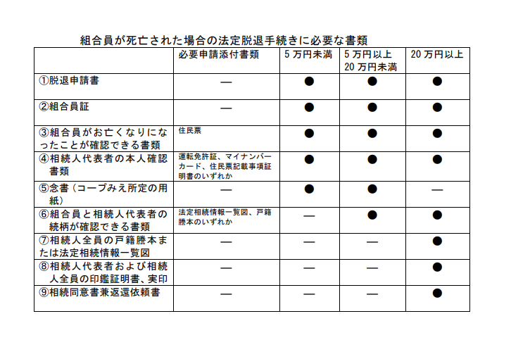 組合員が死亡された場合の、法定脱退手続きに必要な書類は以下の通りです。