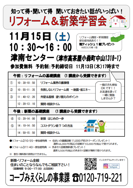 午前:リフォーム② 10:55~ 住まいの健康診断11,000円引きクーポンプレゼント