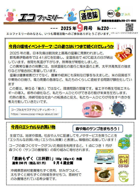 エコファミリー通信誌9月号 2025.10.08 ○今月の環境イベントテーマ 「この暑さはいつまで続くのでしょうか」 ○今月のエシカルなお買い物 「恩納もずく(三杯酢)」160g(40g×4)冷蔵 ↓クリックするとPDFファイルが開きます。
