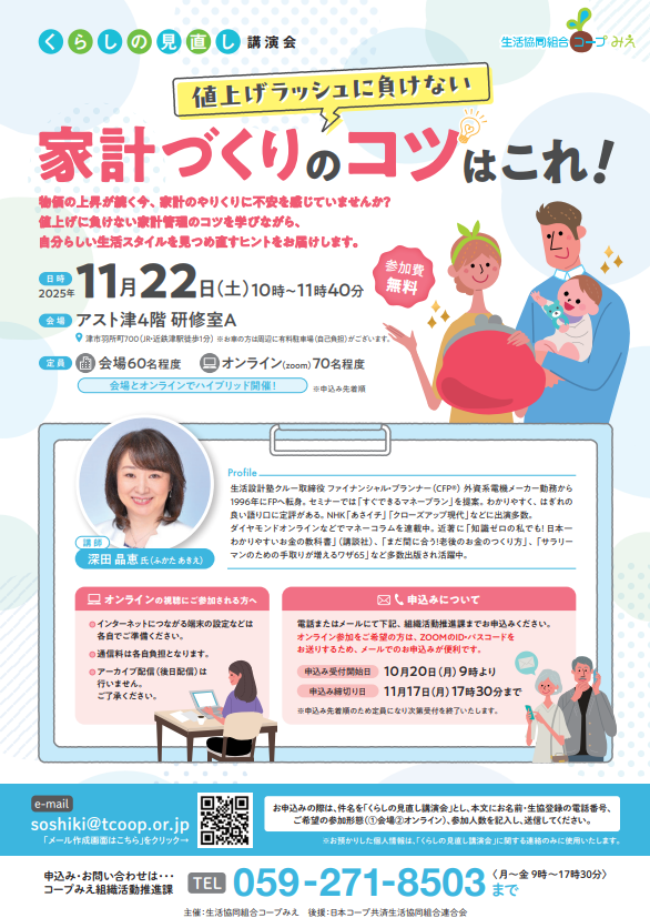 ※件名を「くらし見直し講演会」とし、本文にお名前・生協登録の電話番号、ご希望の参加形態(①会場②オンライン)、参加人数を記入し、送信してください。