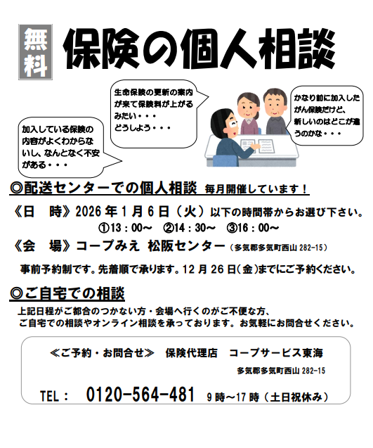 上記日程がご都合のつかない方・会場へ行くのがご不便な方はご自宅やオンライン相談を承っております。