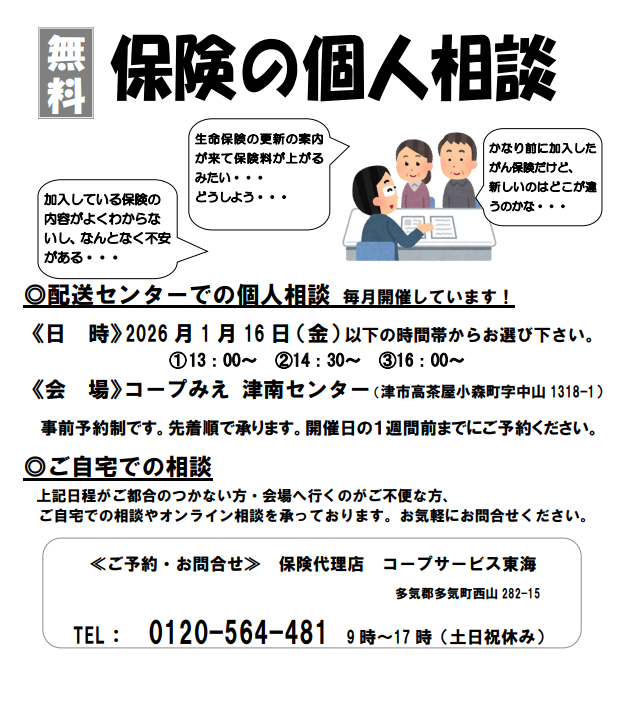 上記日程がご都合のつかない方・会場へ行くのがご不便な方はご自宅やオンライン相談を承っております。