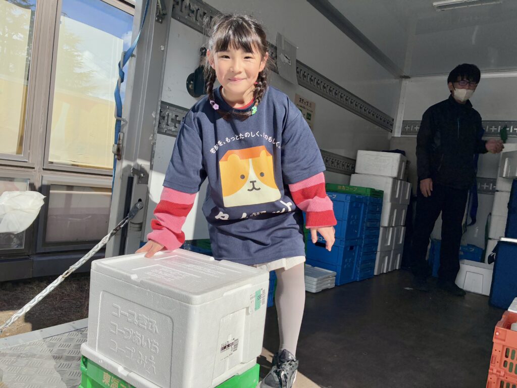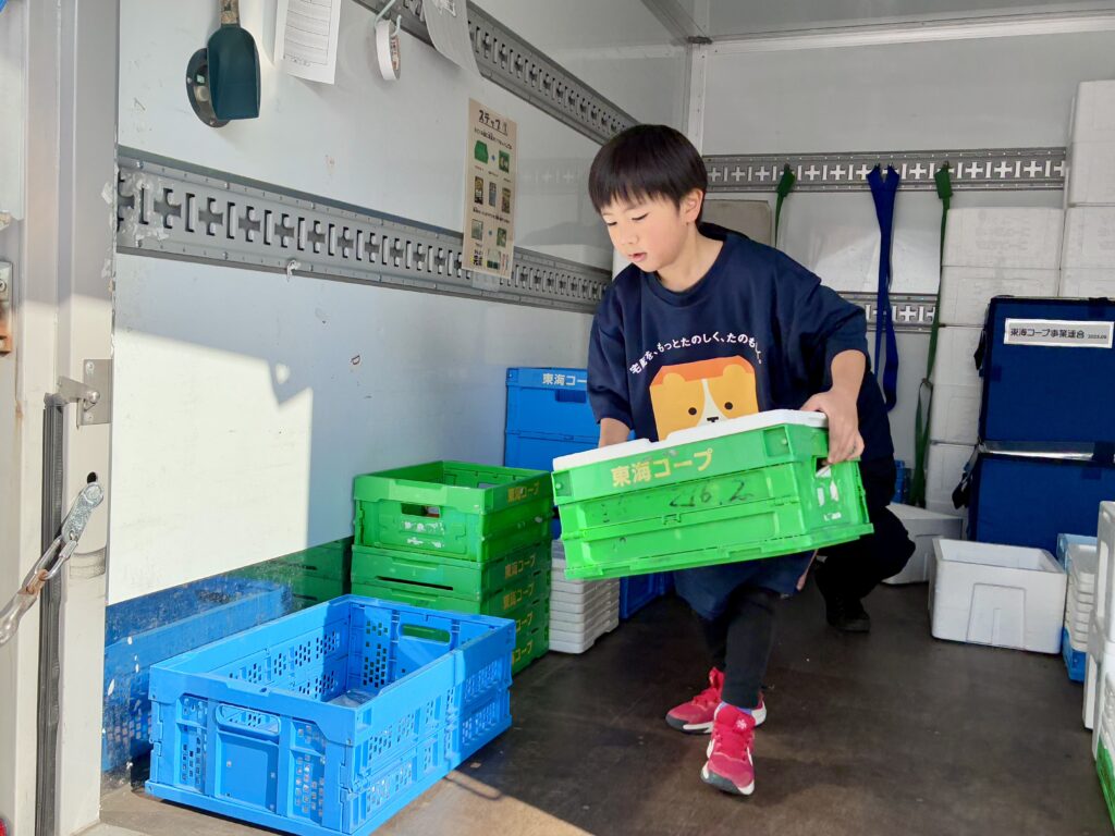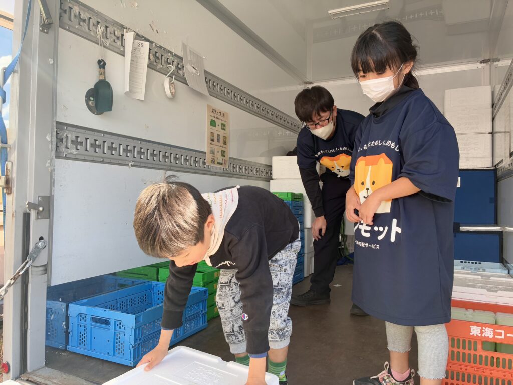 今回のコープのお仕事体験では、子どもたちに宅配トラックに乗ってもらい、組合員さんへ商品を配達するまでの流れを模擬体験してもらいました。