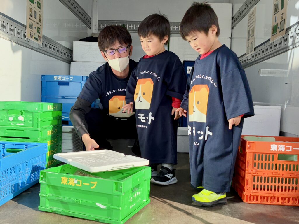 具体的には、本物の食材や商品カタログを使い、トラックから商品を降ろすまでの本格的な工程を体験してもらいました。130名の子どもたちに参加いただき、今年の9月1日から宅配サービスの名称を一新した「タノモット」のTシャツを着て立派な“コープみえの職員さん”として任務を遂行してくれました。