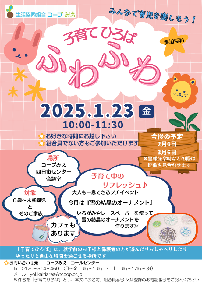 今回は「雪の結晶オーナメント」作成・カフェもあります!