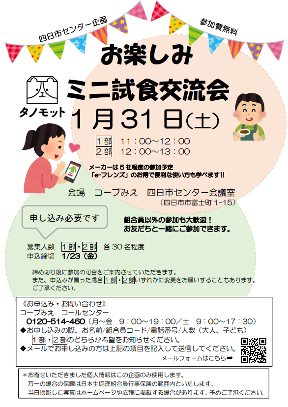 ※お申し込みの際、お名前・組合員コード・電話番号・人数(大人、子ども)/1部・2部のどちらがご希望かをお知らせください。