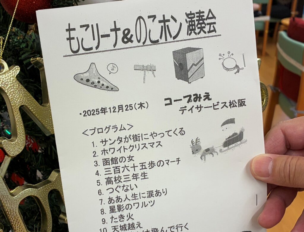 12月25日(木)、コープみえ福祉サービスセンター松阪で毎年恒例のクリスマス会を開催しました。音楽と笑顔、そして「人生100年時代」を象徴する素晴らしい利用者さんがみえることをご紹介します。