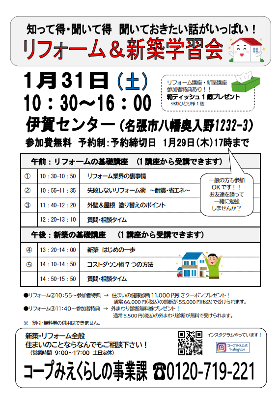 午前:リフォーム② 10:55~ 住まいの健康診断11,000円引きクーポンプレゼント