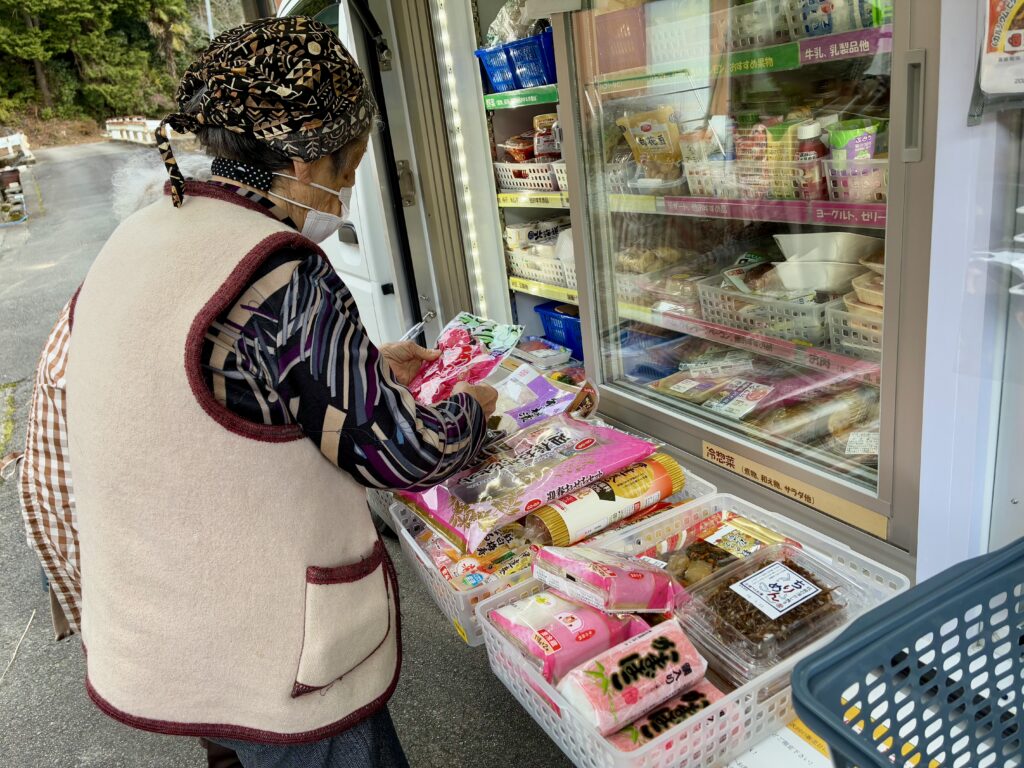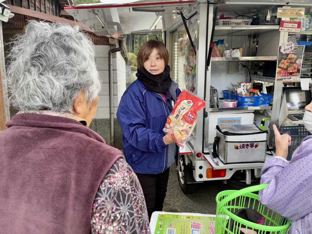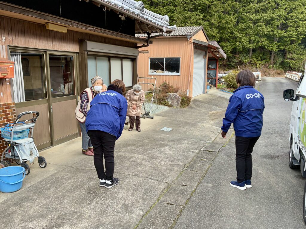 今年も残すところわずか。買い物へ行くのが困難な山間部のこのコースでは、年末最後のお届けとなりお雑煮用の油揚げ、色鮮らかなかまぼこ、伊達巻、そしてご予約いただいたおせちセットや刺身にお肉の確認など、お正月準備の品々が次々とみなさんの手に渡っていきます。「これで無事にお正月が迎えられるわ、ありがとう」そんな感謝の言葉をいただくたびに、私たち職員もこの仕事の意義を深く実感します。