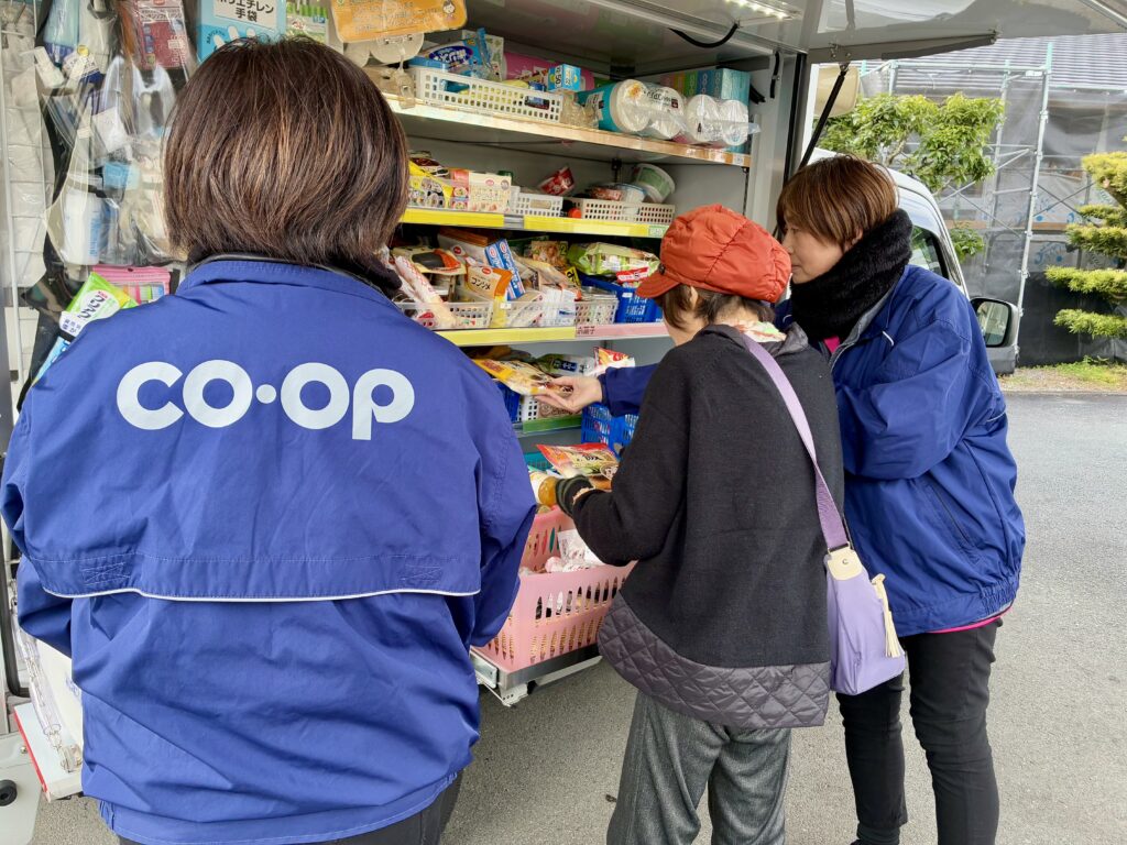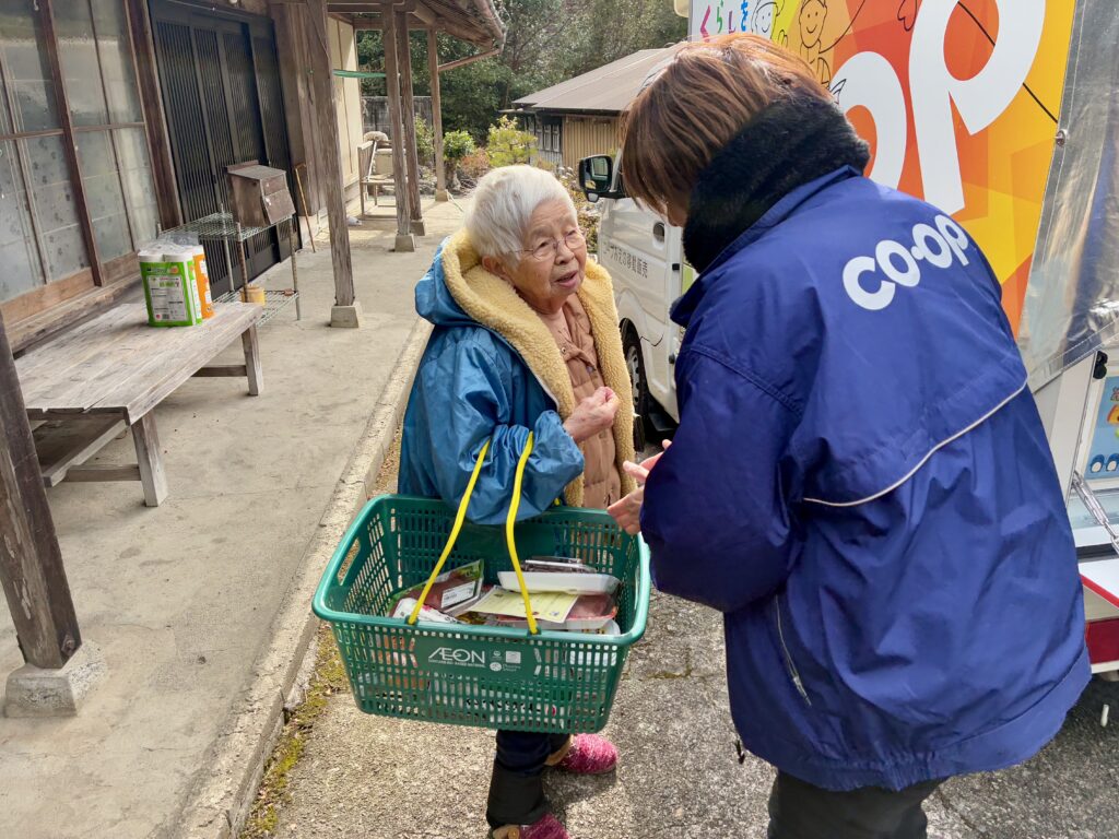 コープみえの移動販売は、商品をお届けするだけではなく「地域の見守り役」としての使命も担っています。担当職員は、しばらくお顔を見られない方がいれば、地域の社会福祉協議会へ連絡をして様子を見てもらうなど、地域のセーフティネットとしての役割も果たしています。この日もお買い物だけでなく、いつものみなさんが自然と集まってこられる様子を見て、こうしたコミュニティの場を守ることの大切さを改めて感じます。
