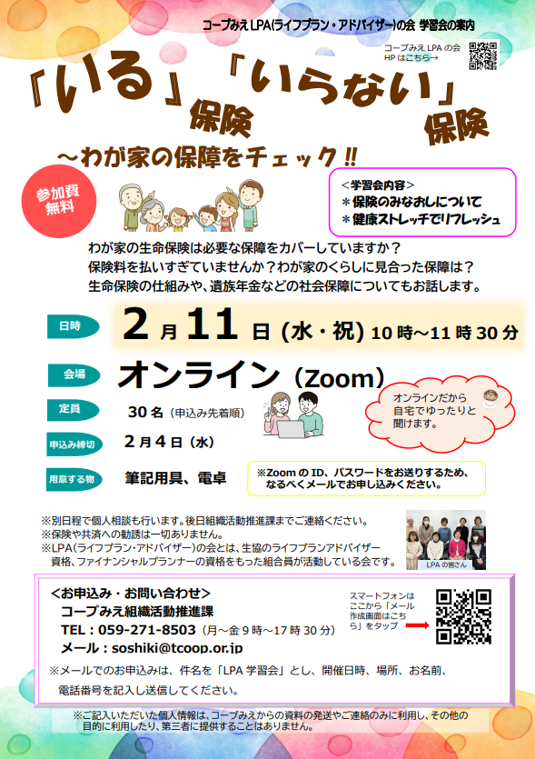 ※LPA(ライフプラン・アドバイザー)の会とは、生協のライフプランアドバイザー資格、ファイナンシャルプランナーの資格をもった組合員が活動している会です。