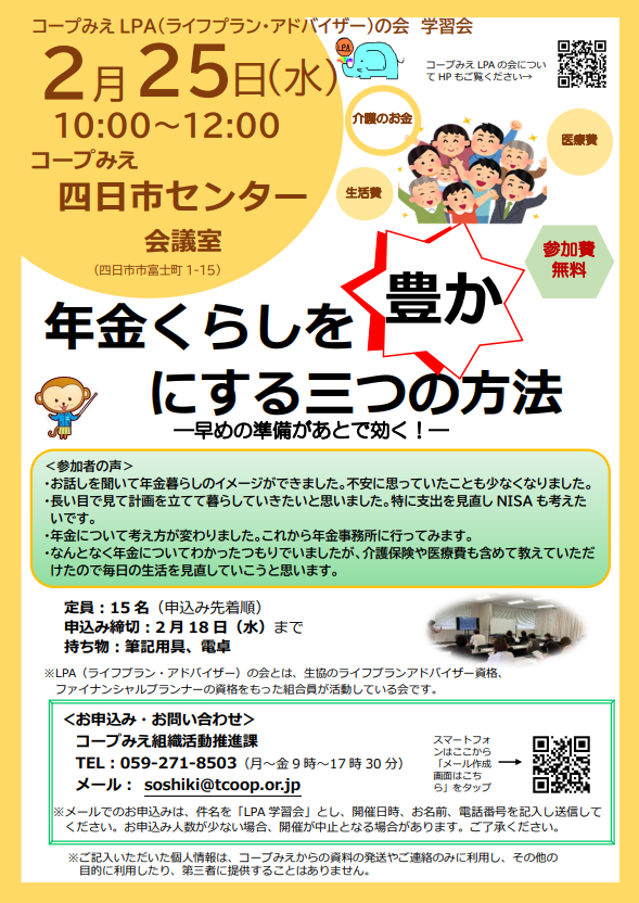 ※LPA(ライフプラン・アドバイザー)の会とは、生協のライフプランアドバイザー資格、ファイナンシャルプランナーの資格をもった組合員が活動している会です。