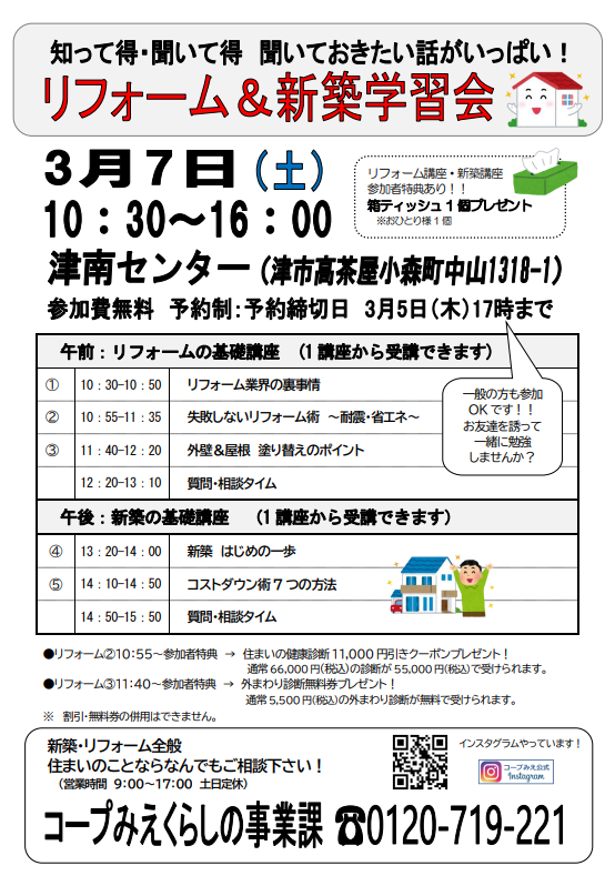 午前:リフォーム② 10:55~ 住まいの健康診断11,000円引きクーポンプレゼント