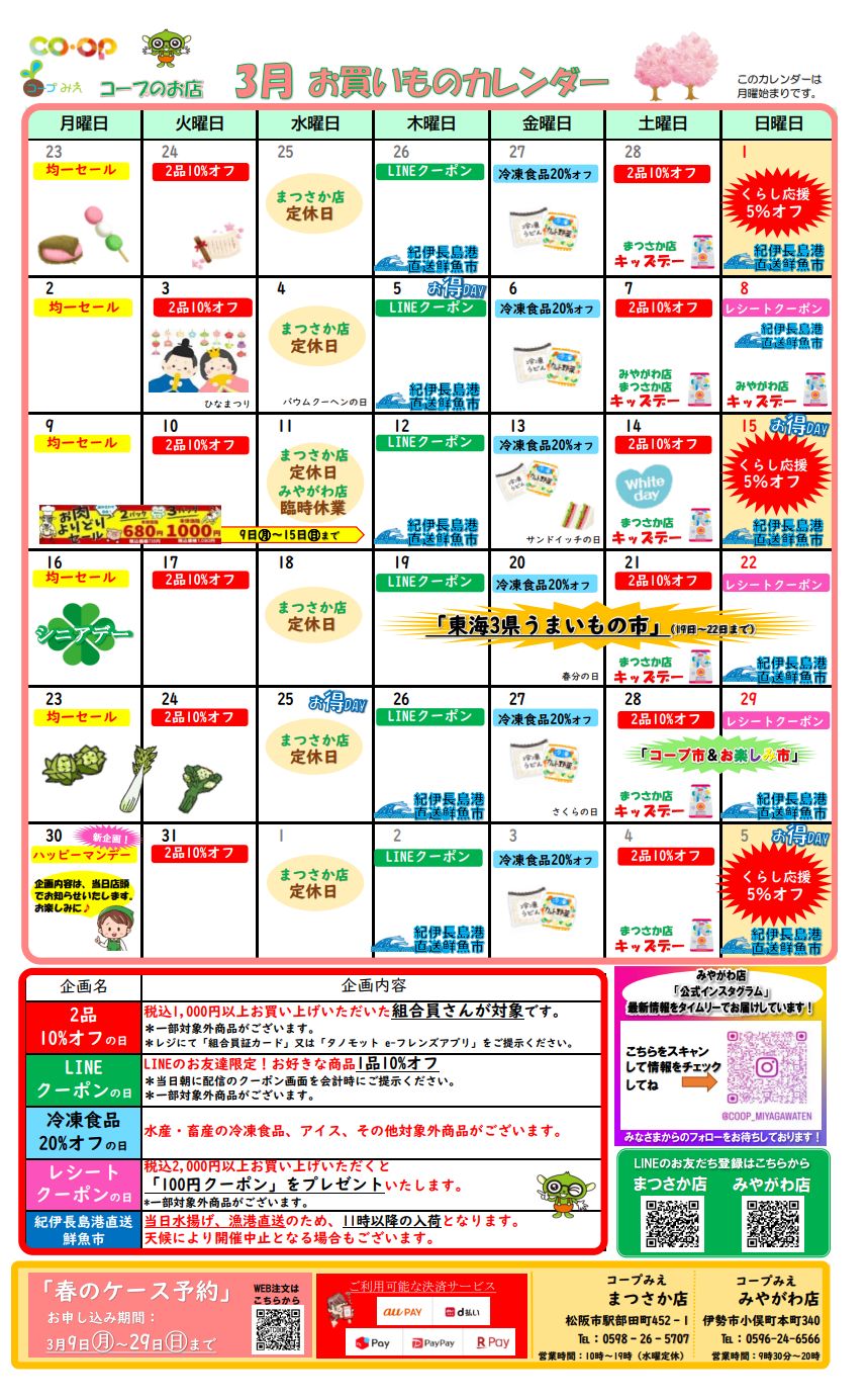 3月お買い物カレンダー 2026.02.25 ■イベント情報 3月1日(日)・15日(日)「くらし応援 全品5%オフ」!*一部対象外商品がございます。 3月19日(木)~22日(日)「東海3県うまいもの市」開催! ご来店お待ちしております♪