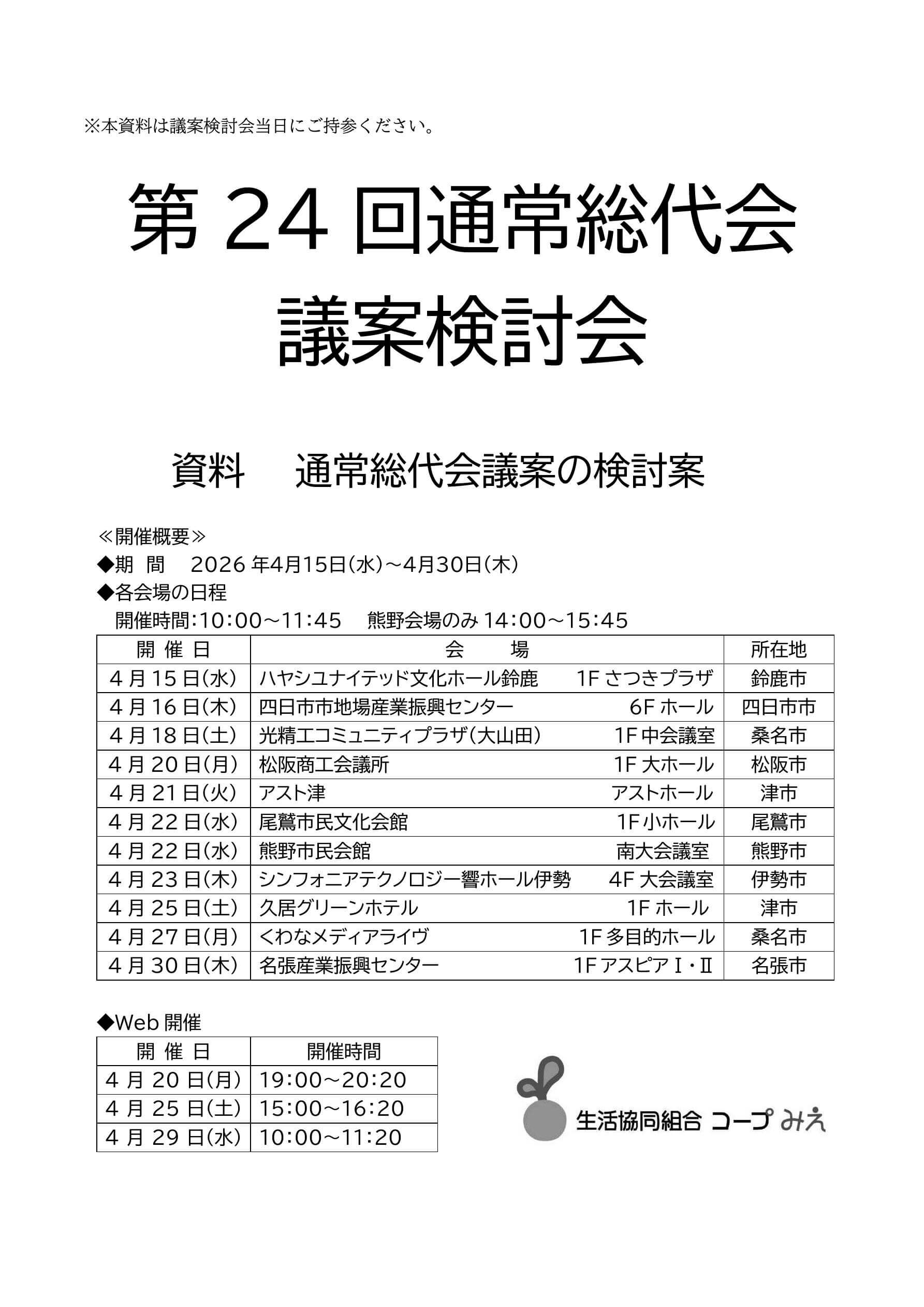 6 月に開催する「第 24 回通常総代会」に向けて事前に総代会議案について総代のみなさんに議論いただく