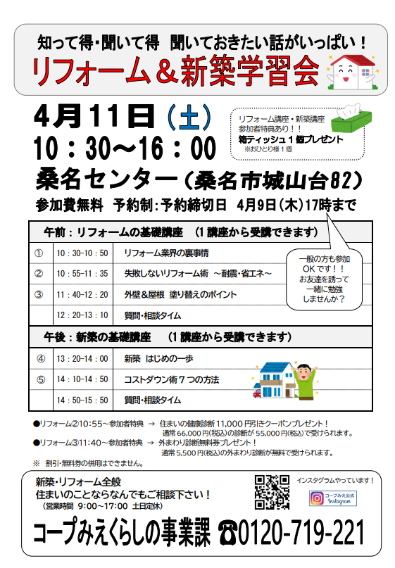 午前:リフォーム② 10:55~ 住まいの健康診断11,000円引きクーポンプレゼント