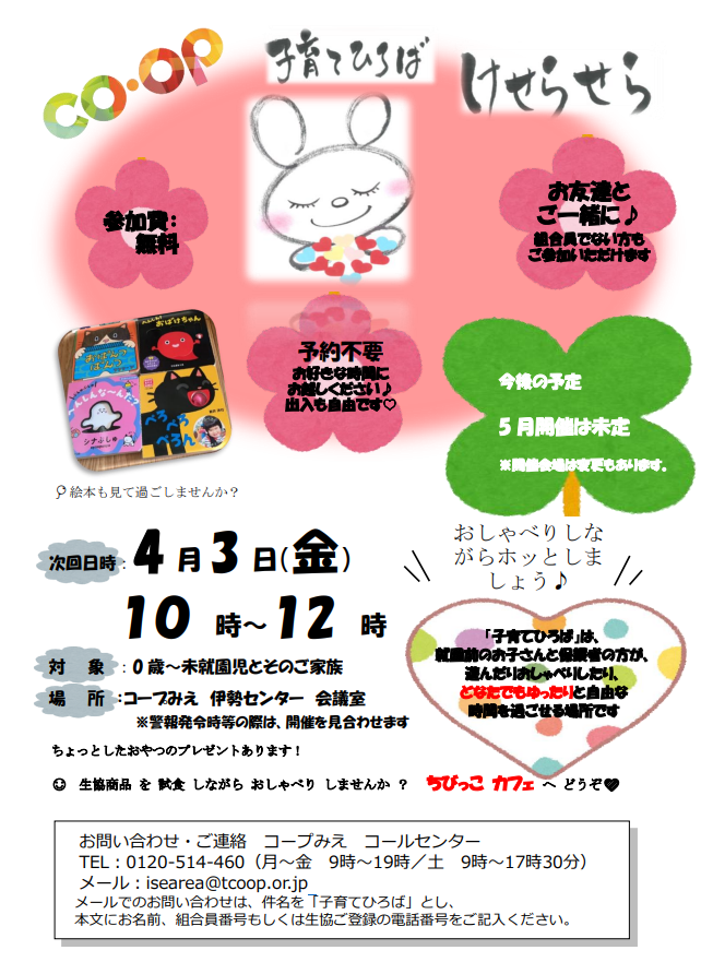 メールでのお問い合わせは、件名を「子育てひろば」とし、本文にお名前、組合員番号もしくは生協ご登録の電話番号をご記入ください。