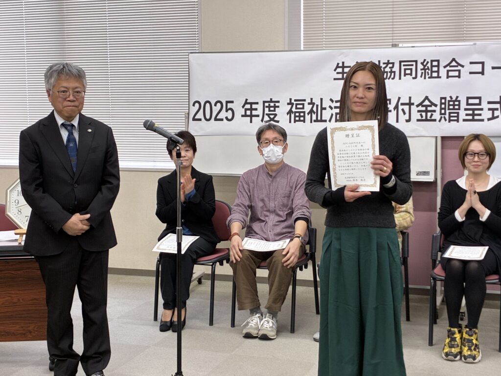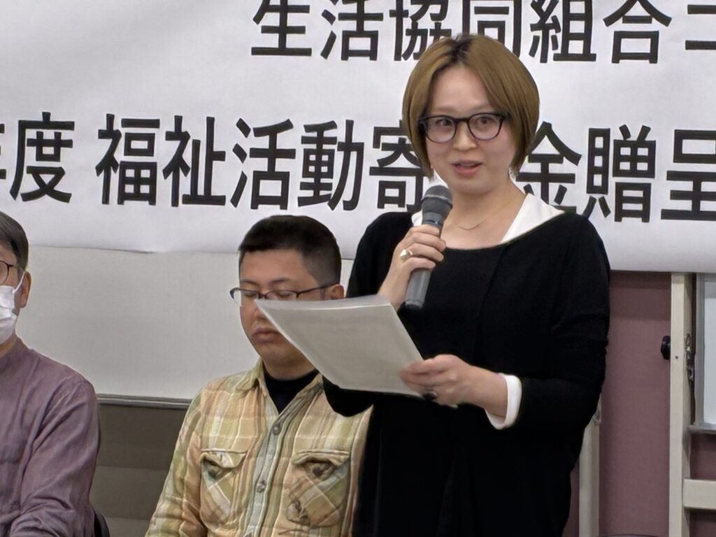 「日々の活動で、地域のつながりや民間支援がいかに現場の支えになっているかを実感しています。今回いただいた寄付金は、資金以上の大きな励ましです。託された思いを大切に、支援を必要とする方々へ届けてまいります。」とあいさつされました。