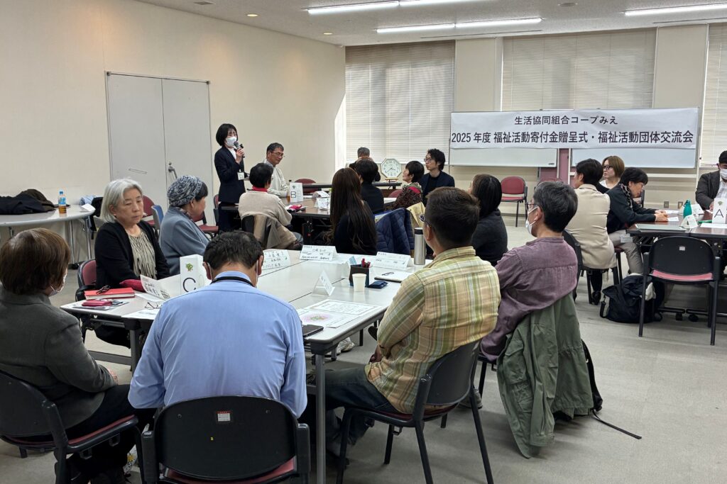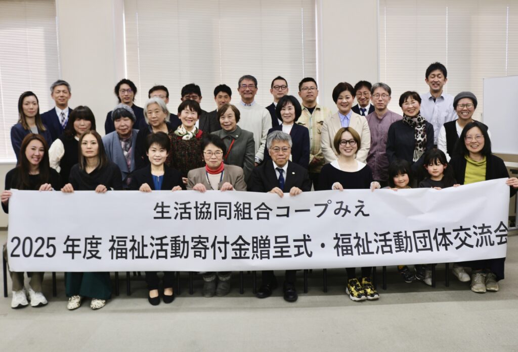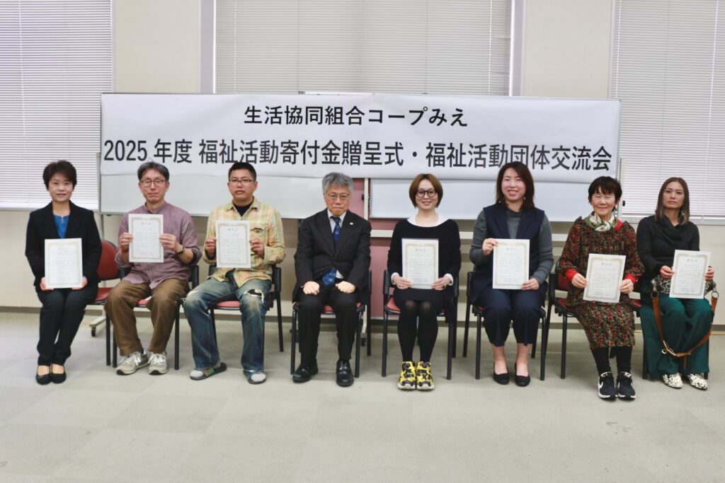 福祉活動寄付贈呈は、コープみえの基本理念「つながりあう安心、笑顔が輝く くらし」に基づき、地域課題の解決に挑む団体を応援するもので、2018年より継続しています。