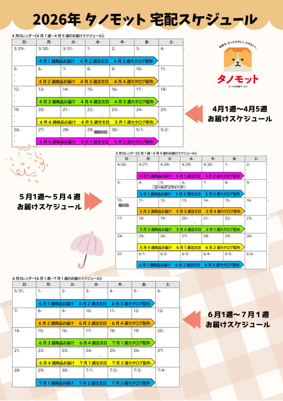 タノモット宅配スケジュール(2026年4月1週~7月1週お届け分まで)