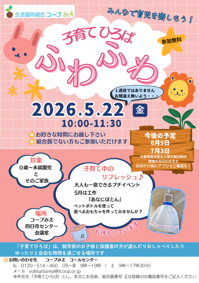 ※件名を「子育てひろば」とし、本文にお名前、組合員番号または生協にご登録のお電話番号をご記入ください。