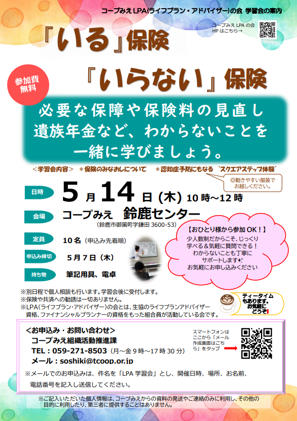 ※LPA(ライフプラン・アドバイザー)の会とは、生協のライフプランアドバイザー資格、ファイナンシャルプランナーの資格をもった組合員が活動している会です。