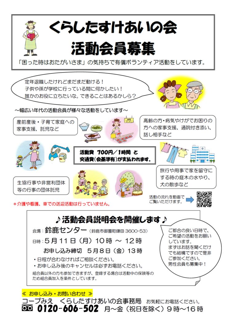 くらしたすけあいの会 活動会員募集 鈴鹿センター