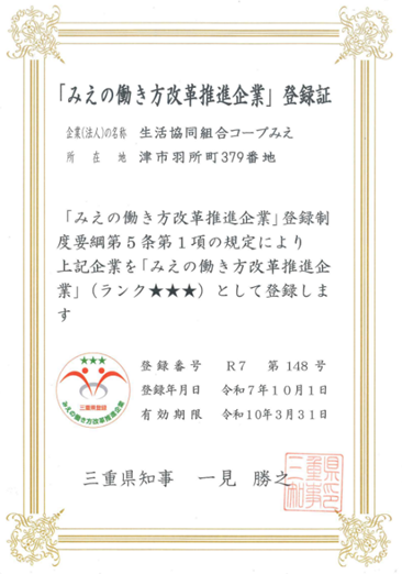 2025年度にみえの働き方改革推進企業3つ星が認定されました。