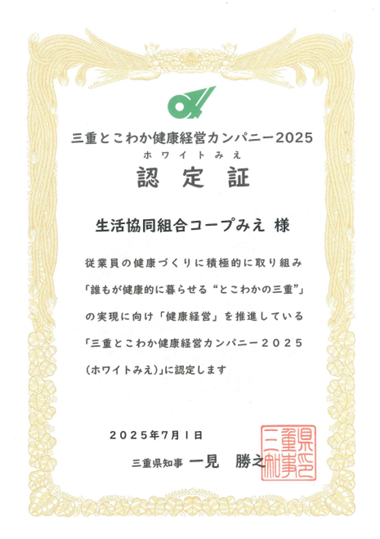 2022、2023、2024、2025年三重とこわか健康経営カンパニー(ホワイトみえ)に認定されました。