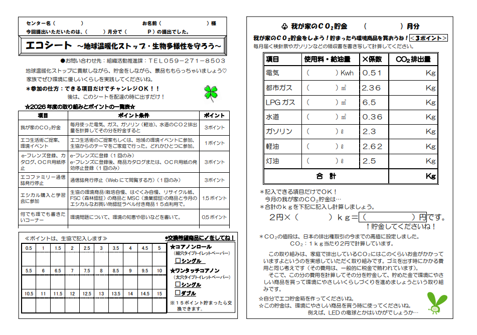 エコ生活術のご提案もしくは、地域の環境イベントにご参加、生協からのテーマをご家庭で行った。どれかひとつに参加していただいています。